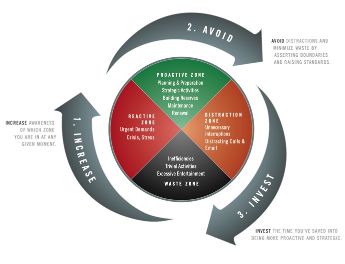 Three Practices: Increase awareness, Avoid distractions and minimize waste, and Invest time in being proactive