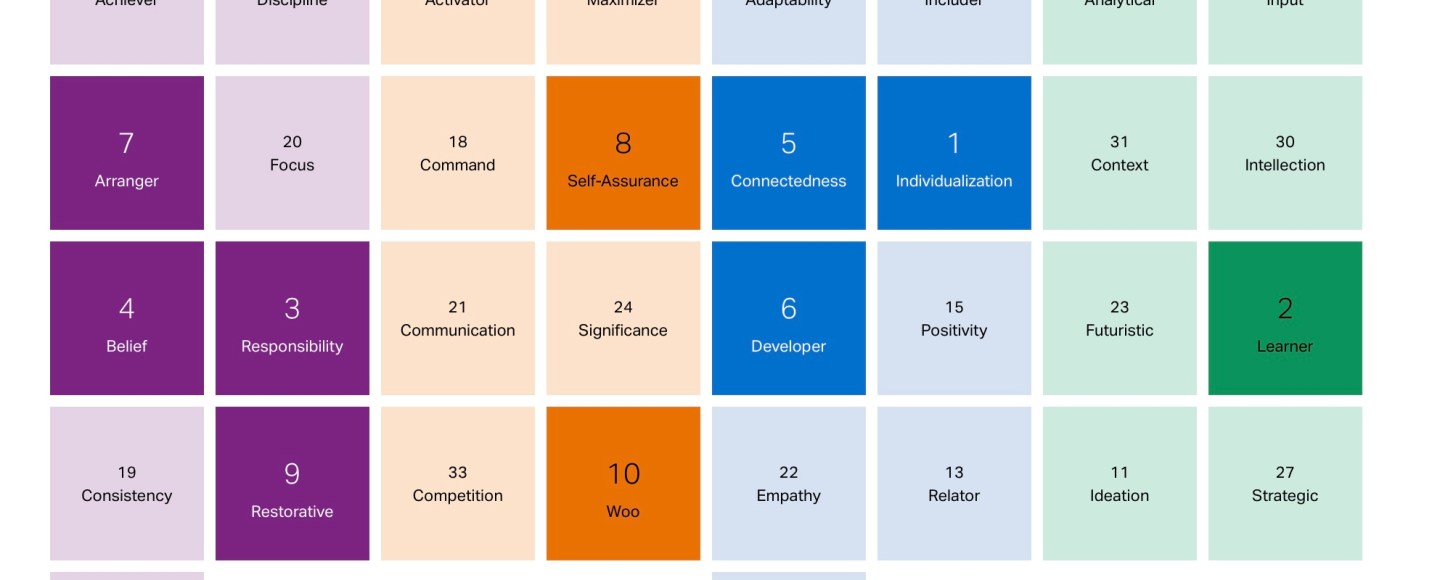 The best thing to remember about StrengthsFinders, in my opinion is the fact that every person carries all 34 Strengths, not just the five from your initial assessment.