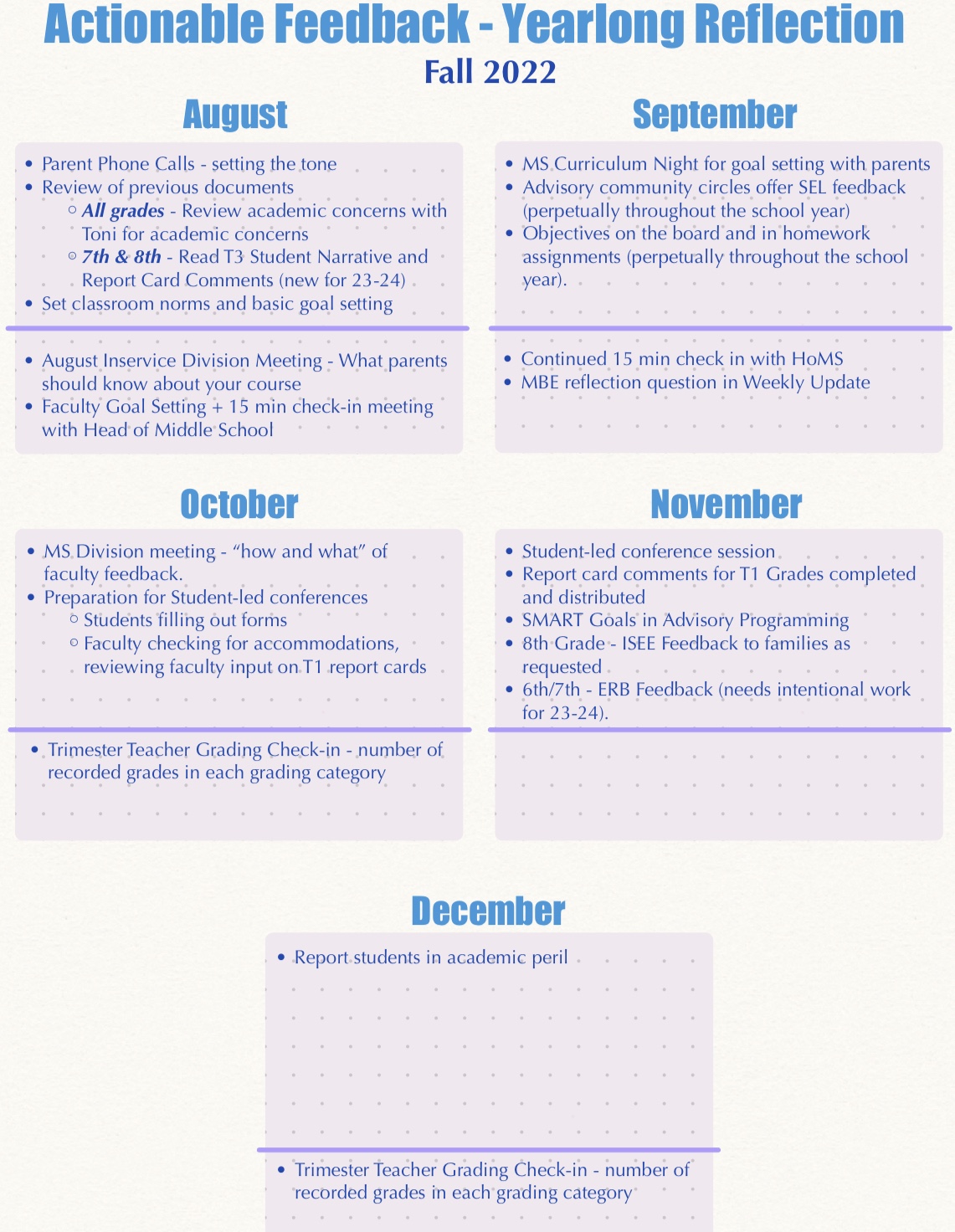 Seems pretty simple, right? But the goal of the Success Statement is not necessarily innovation but a picture of what the final product to do or say. Our tactic for the year has been consistently revisiting the feedback process in middle school division meetings interlaced with leadership conversations about how we will direct the feedback conversation. These leadership meetings included administrative personnel and grade-level deans, who serve as a voice for their grade-level teams.